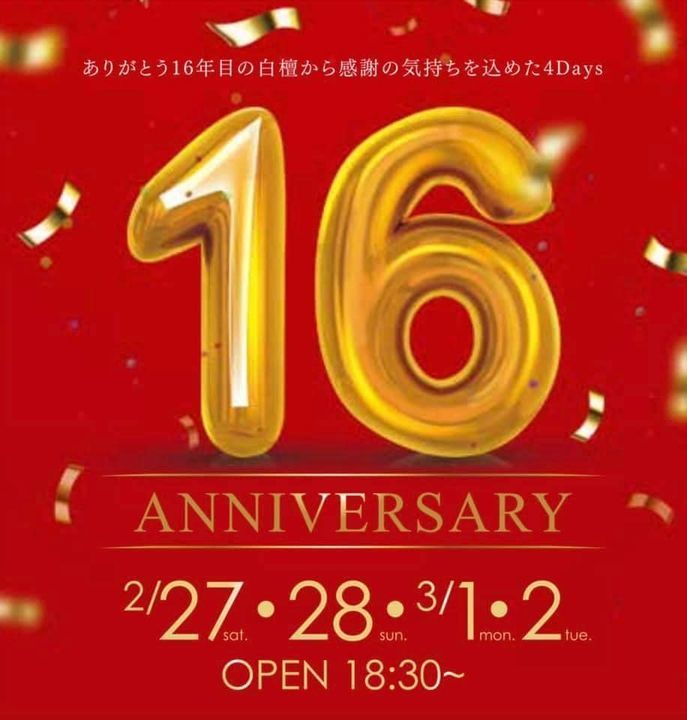 おかげさまで白檀は、2021年3月2日(火)で、16周年を迎えます。 日 頃 の ご 愛 顧 に 感 謝 の 気 持 ち を こ め て 、ご 来 店 い た だ い た す べ て の お 客 さ ま に 、2 月 2 7 日( 土 )・ 2 8 日( 日 )・ 3 月 1 日( 月 )・ 2 日( 火 )の 4 日 間 、通 常料金より500円OFFの男性2,500円・女性2,000円にてイベント を 開 催 し て お り ま す 。
