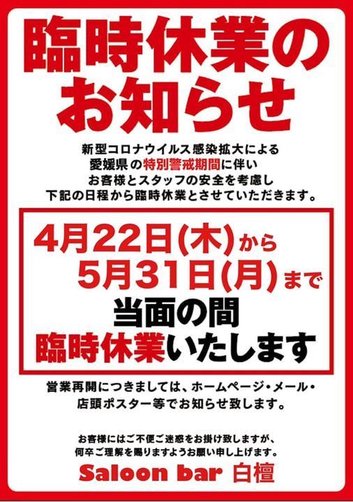 ■県の時短要請の方針通り【5月31日まで】休店いたします。