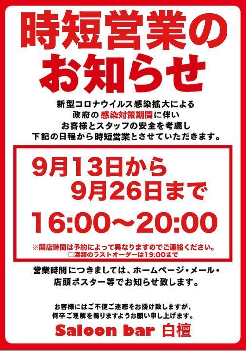 【感染対策期間】白檀16日から26日まで16時〜20時の時短営業!