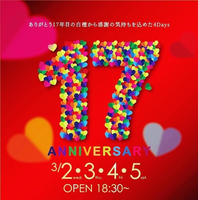 本日㊗️おかげさまで白檀は、2022年3月2日(水)で、17周年を迎えます。