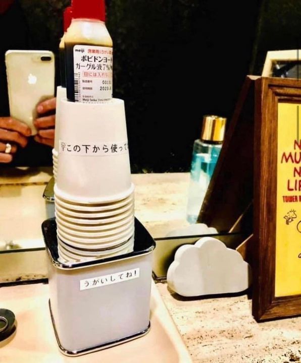 "ポビドンヨード"うがい薬をトイレに設置いたしました。みんな苦いけど"うがい"したらスッキリするよ✌️