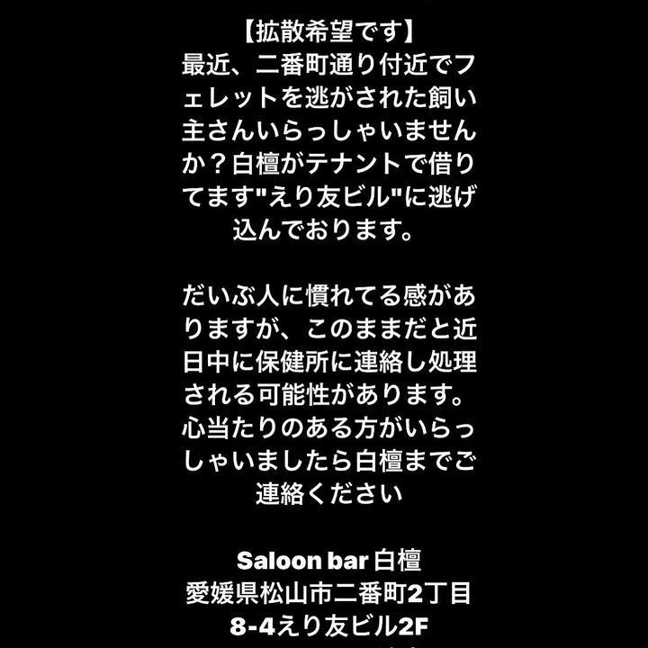 最近、二番町通り付近でフェレットを逃がされた飼い主さんいらっしゃいませんか?白檀がテナントで借りてます"えり友ビル"に逃げ込んでおります。