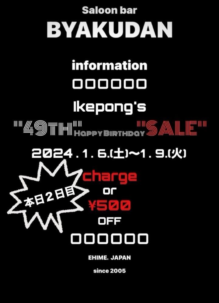 白檀マスターいけぽん誕生日を祝して1月6日から9日までの4日間、チャージ無料or飲み放題500円割引セール実施いたします㊗️是非是非、ご来店よろしくお願いいたします㊗️