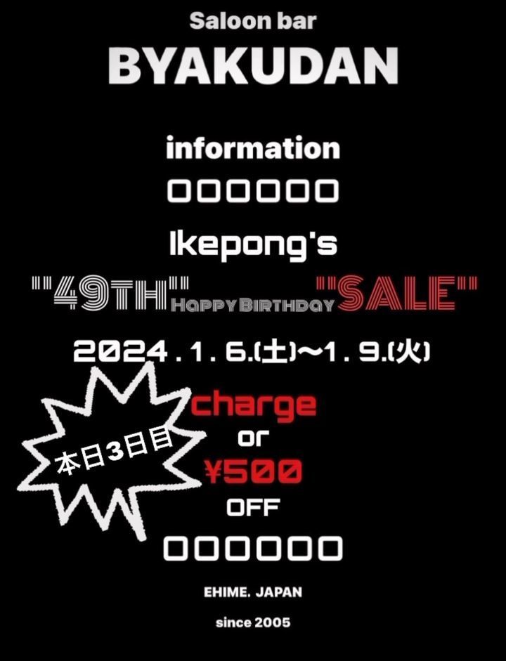 白檀マスターいけぽん誕生日を祝して1月6日から9日までの4日間、チャージ無料or飲み放題500円割引セール実施いたします㊗️是非是非、ご来店よろしくお願いいたします㊗️