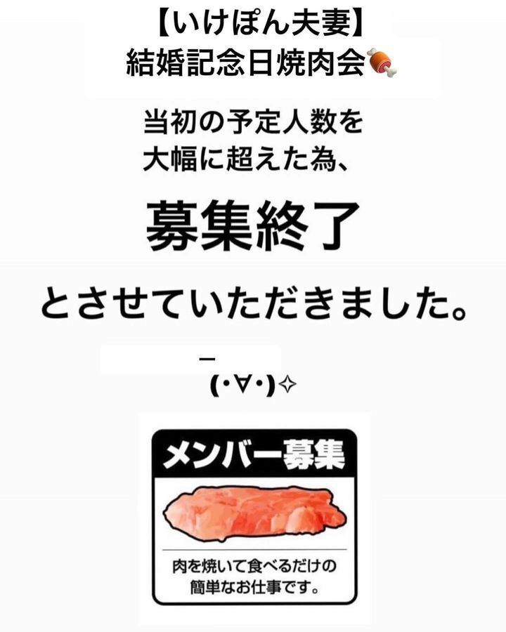 9/22((日)の毎年恒例の"いけぽん夫妻結婚記念日焼肉会'24"当初の予定人数を大幅に超えた為、募集終了とさせて頂きます。